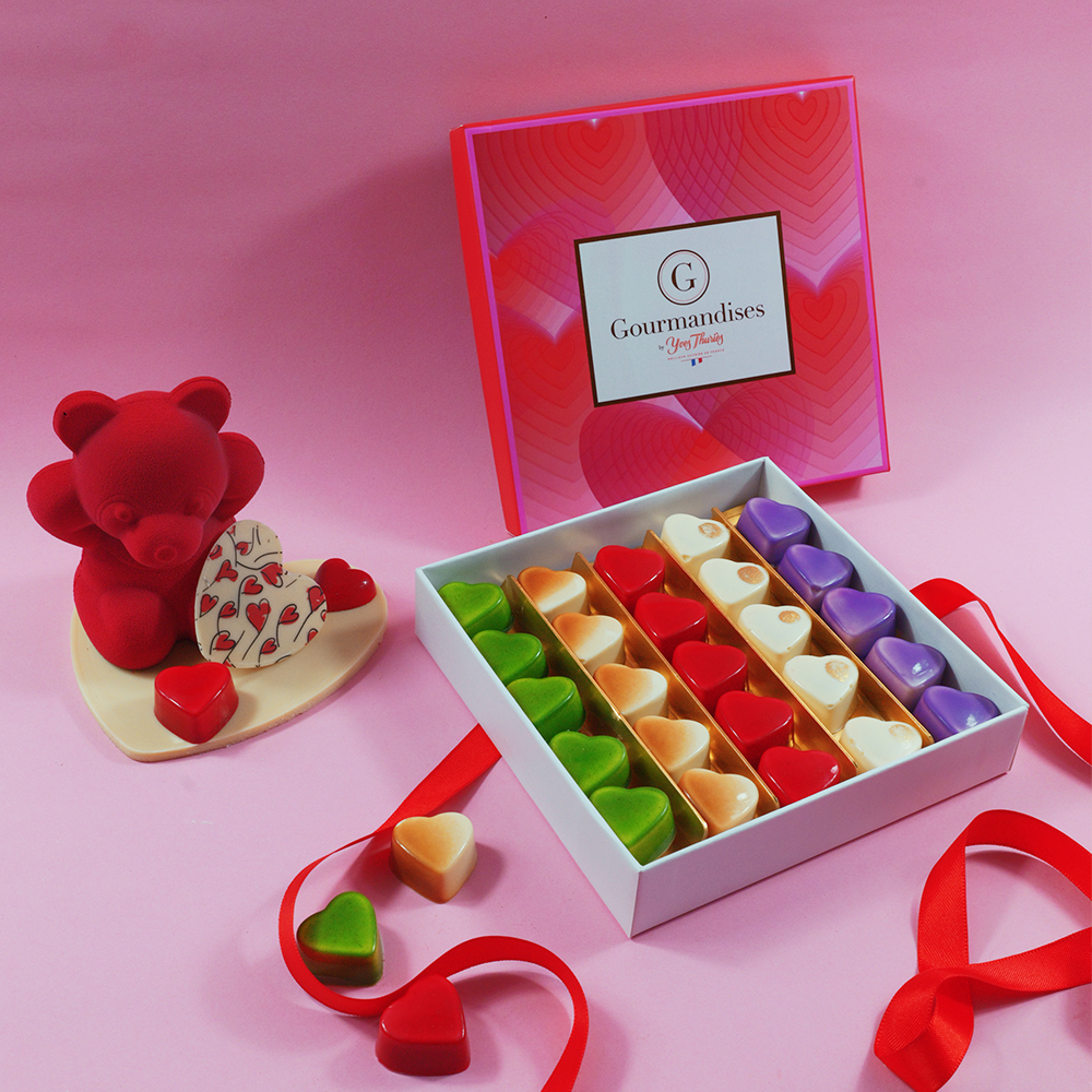 HomeSanValentinBombonesBombones Verde: Chocolate blanco y ganache de pistacho Blanco con naranja: Choc. blanco y ganache de coco limón Rojo: Choc. Blanco y ganache de praliné Blanco: Chocolate blanco y ganache de vainilla Morado: Choc. Blanco y ganache de lavanda y durazno Related products Rose Read more Framboise Read more Parfait Read more